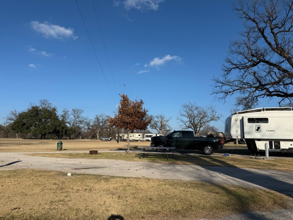 Today’s stop is called Pecan Valley RV Park. We love it and may stay a few days. Spaces are all pull throughs, ginormous sites, quiet, only about 6 campers. It feels like we are in a park – a very nice and well taken care of park. The owner has chickens and fresh eggs are available.
