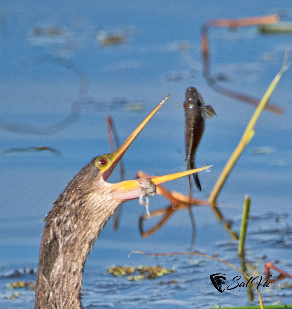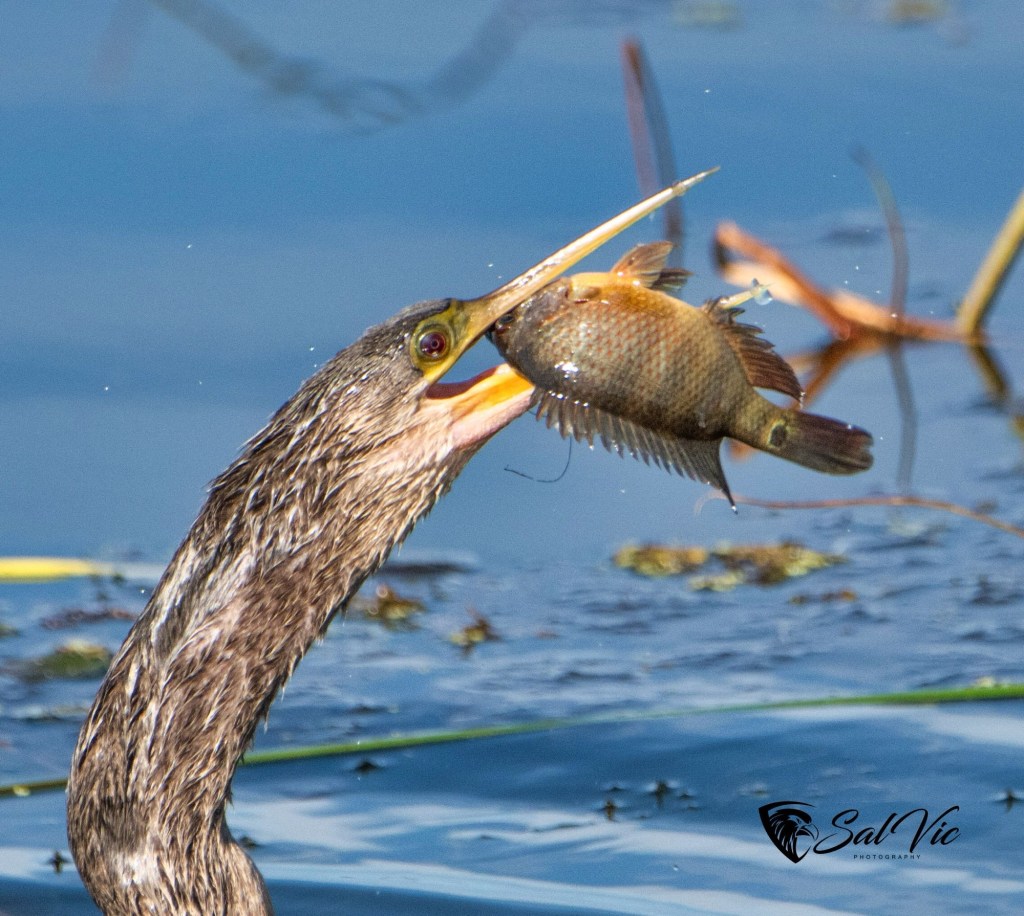 This is a sequence of an Anhinga feasting on a catfish. He tossed it up in the air and let it drop, then grabbed it. It needs to be well lubricated to be swallowed.