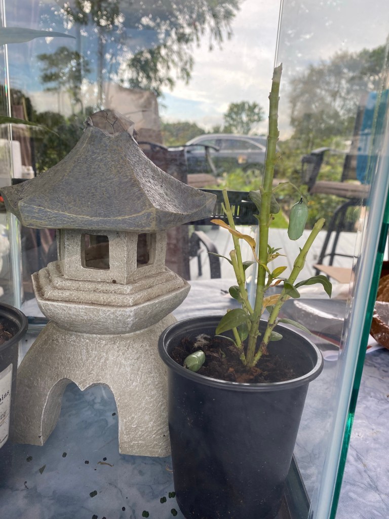 I know, crazy right? Monarchs only lay their eggs on milkweed and only eat milkweed while in the caterpillar stage so we got some milkweed plants at a nursery about an hour away and since then are seeing all kinds of activity. Victor has a photo of a monarch laying an egg! So far I haven’t gotten a copy. However I can share pictures of larvae and even a chrysalis!