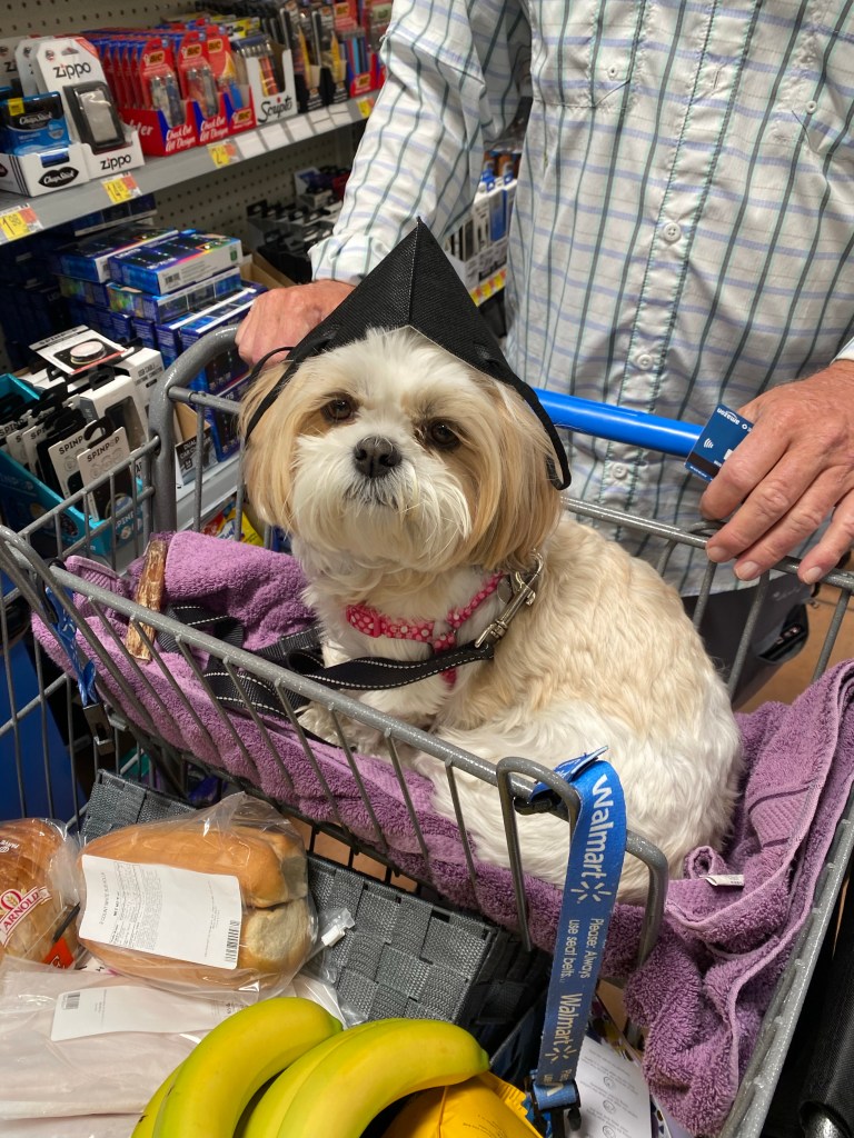 Because everyone wants to know how Zoe is doing I’m adding a pic of her helping us shop in Walmart a few days ago. She is wearing Vic’s mask as a hat. She was very anxious the last few days getting ready to leave. It’s a new routine and she’s a good traveler, she’s OK.