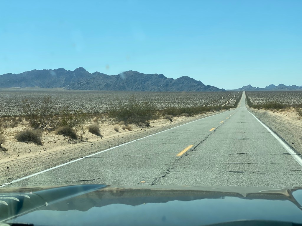 Marine Corp base in the desert. It’s a city unto itself in San Bernardino County. Elev about 2,000 feet. We planned to boondock in Quartsite AZ but did not like the rough unpaved twisty turny narrow road the GOS was telling us to take. Uh uh! There were several rv parks along the side of the road but we decided to push on through and come here. We’ve been to the commissary twice. Today we got sushi for lunch. We went into town and found a couple of souvenirs and talked about driving around in Joshua Tree National Park but it’s like a million degrees and even dry heat is super hot. Tomorrow we will go to Bakersfield CA.