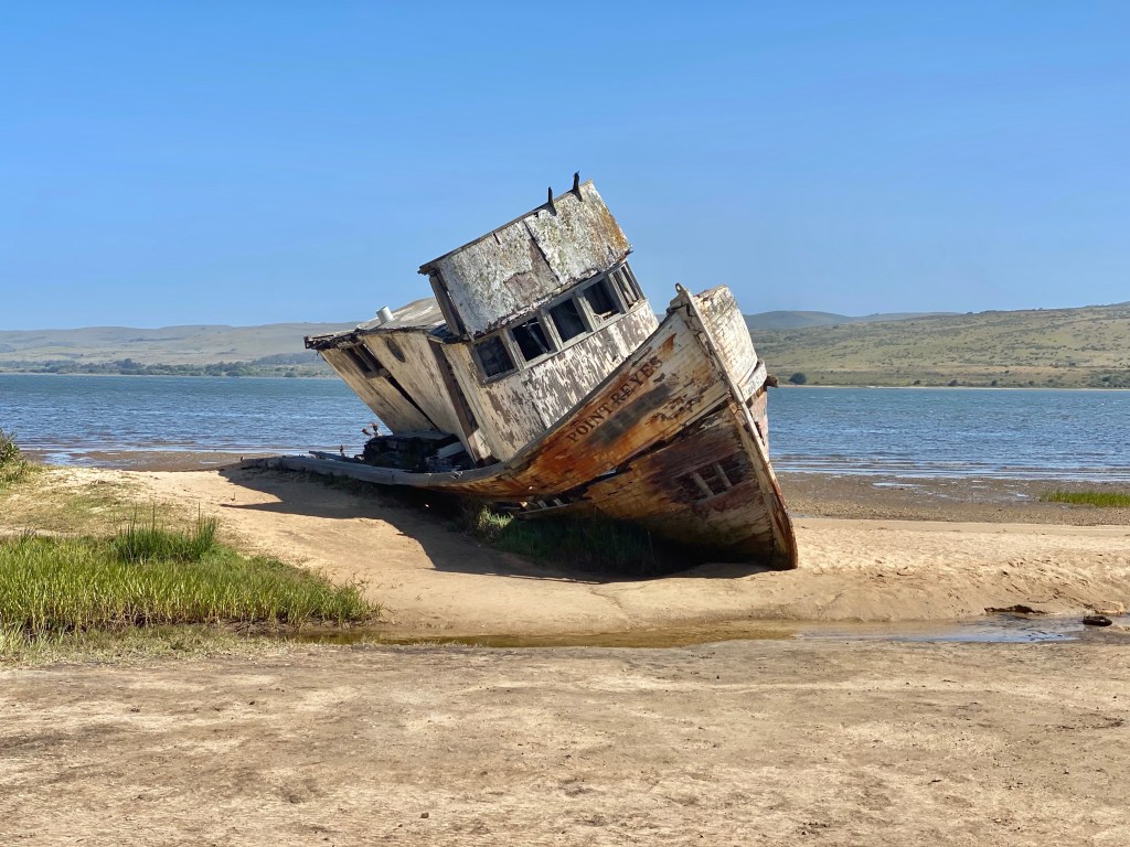 Yesterday we drove around to see some sights. Saw the lighthouse (a cold and windy walk to get to a point where it could be seen), an abandoned and beached boat, and elephant seals at Point Reyes.