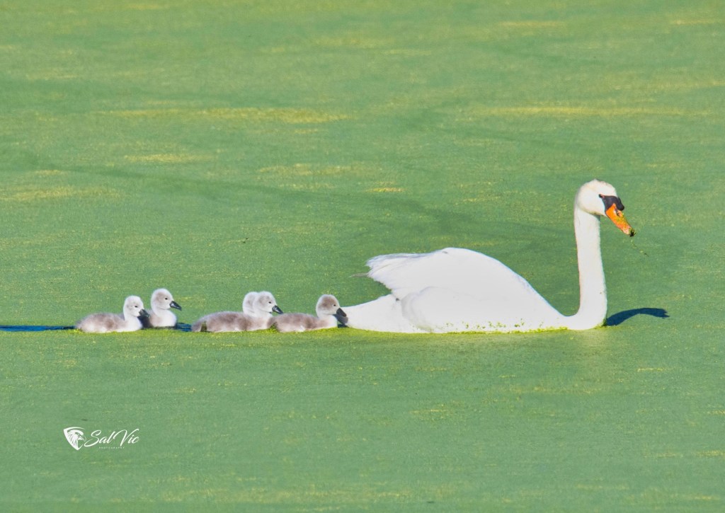 The RV park is tucked way in the back of the base, there are only 6 spaces, with loads of room in between. It’s spotlessly clean, with a playground nearby and a large pond where there are 3 sets of Canadian geese families. Each family unit has several offspring and each set is at a different stage of development. Also there is a pair of white swans with babies – so cute!