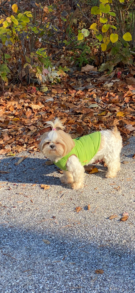This is Zoe in her winter coat this morning walking around the cul de sac here in NH. It got down to 34 overnight. We had to get more propane this morning when we ran out about 7 am.