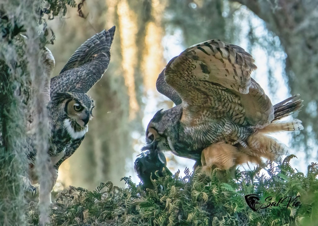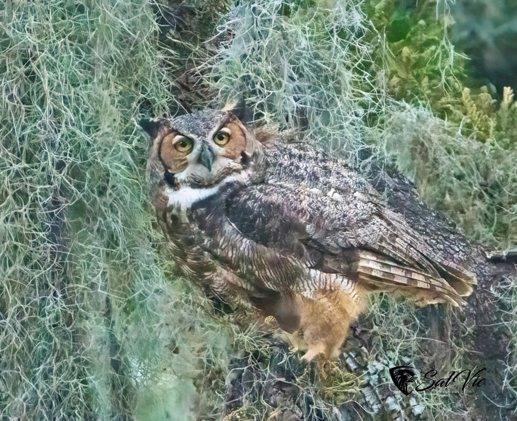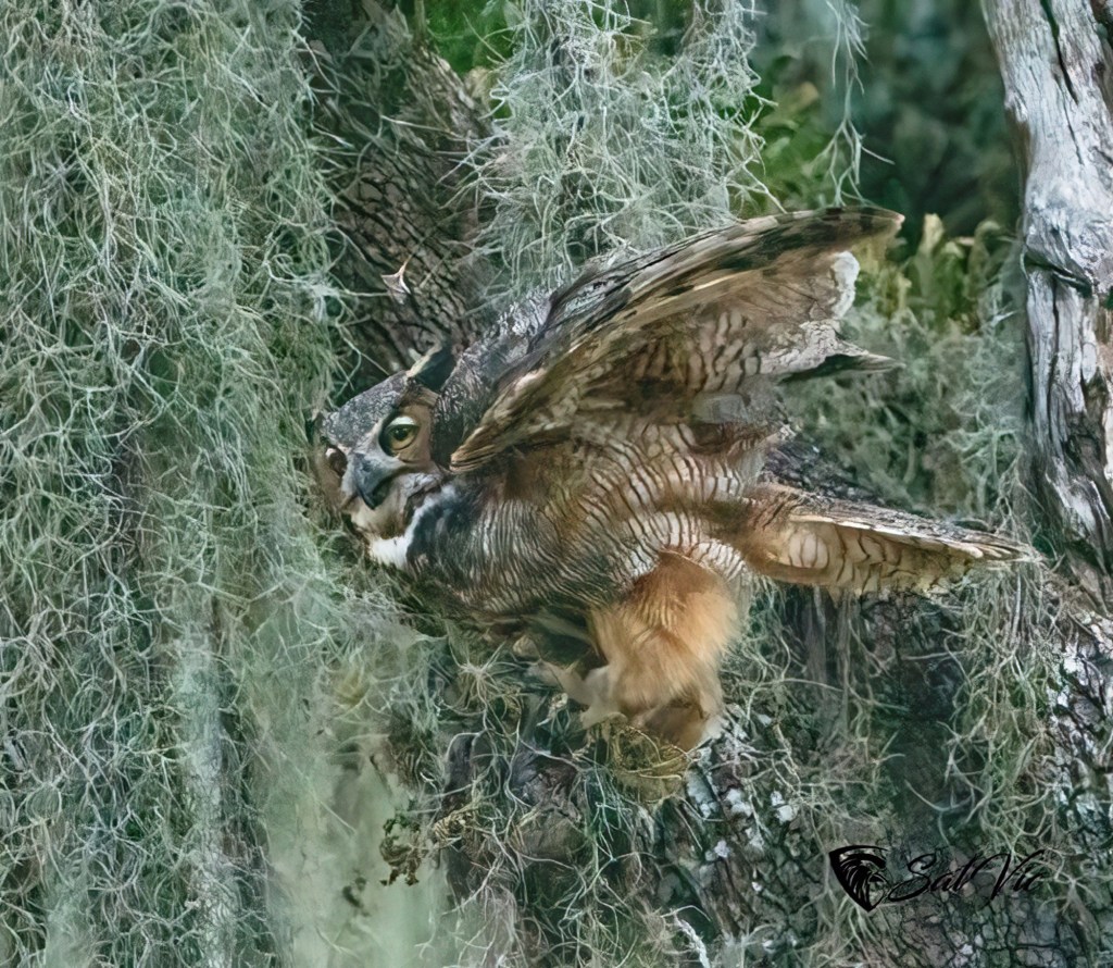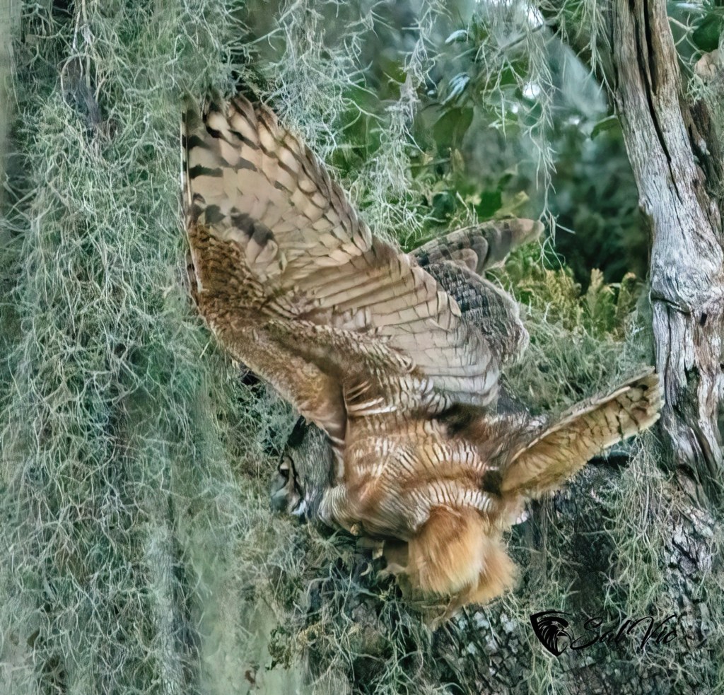 This afternoon we went to see the Great Horned Owl nest on Joe Overstreet. OMG people you will not believe these pictures. Remember these birds are tucked back in a tree dripping with Spanish moss so they are hard to see and it’s dark. Most of the time we couldn’t clearly see what was going on but we knew something was happening because they were moving around. You wouldn’t believe the work Vic does to bring out the detail and colors. The technical term for this is called spray and pray haha.