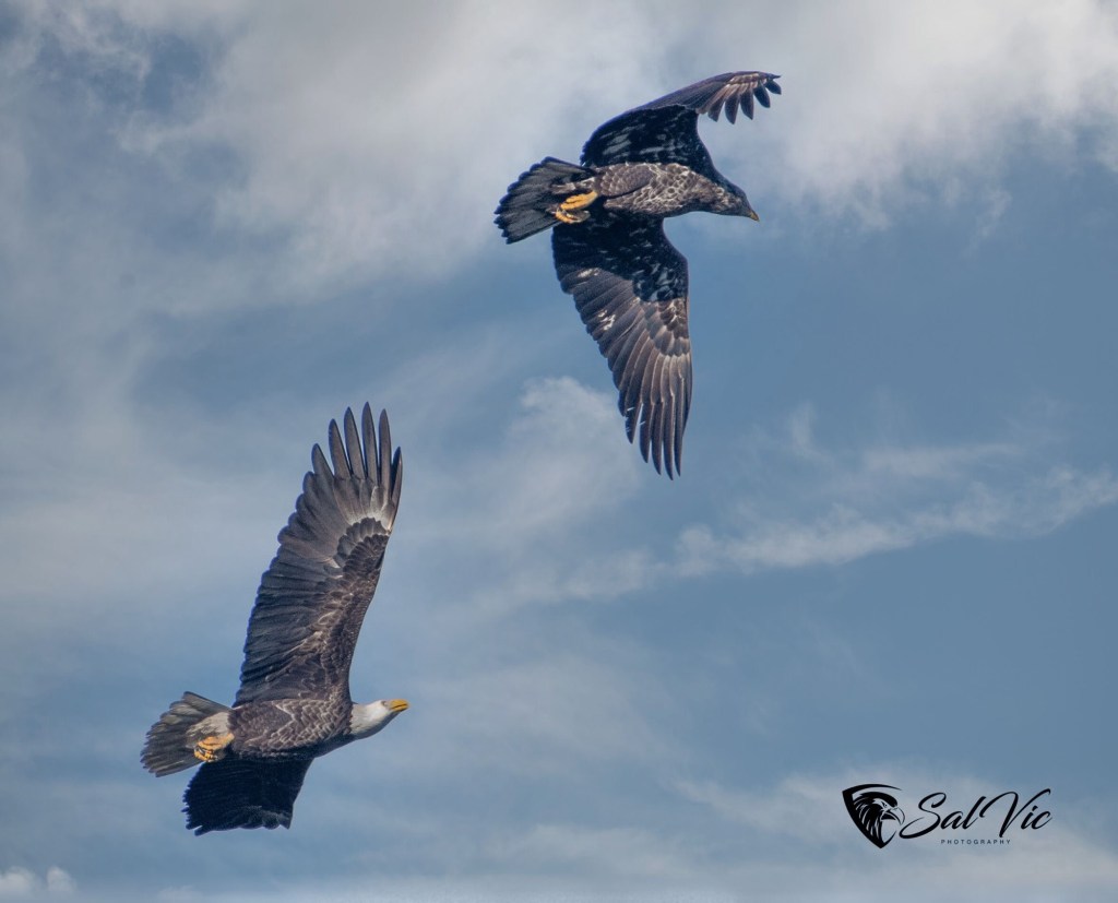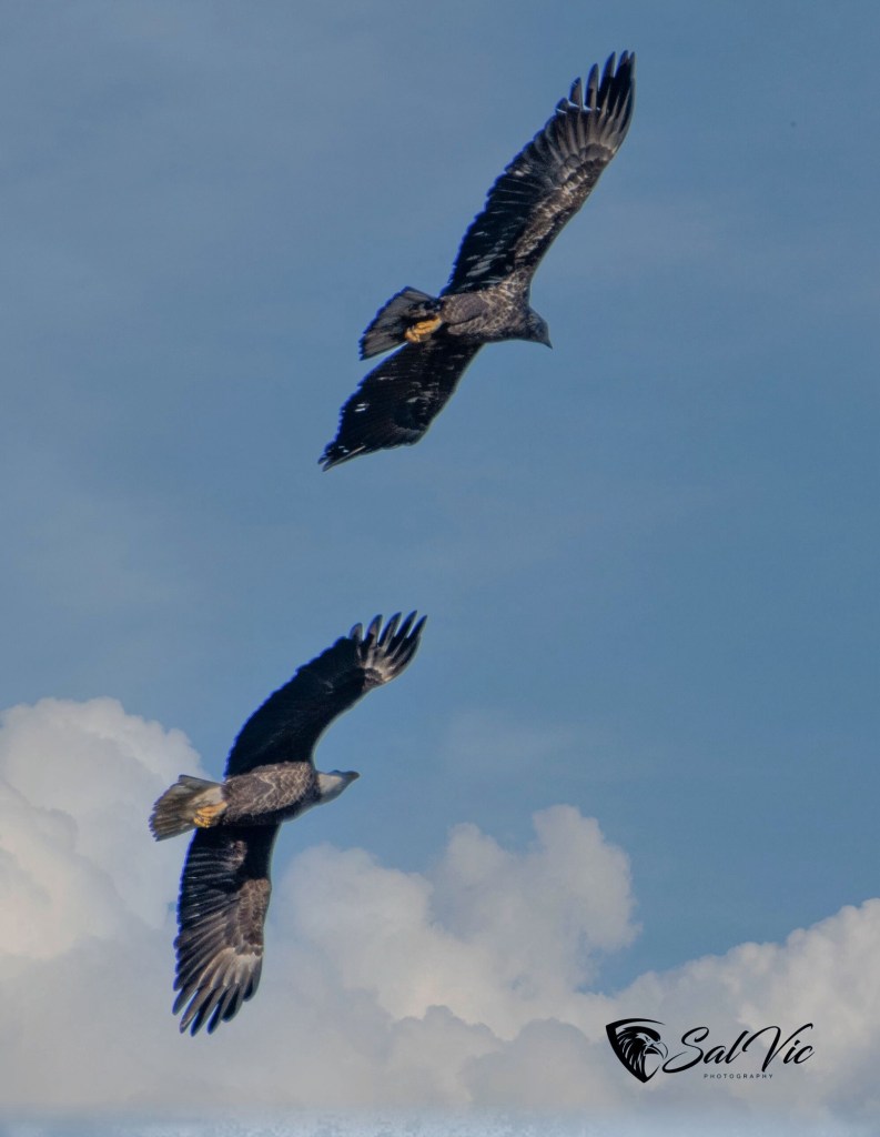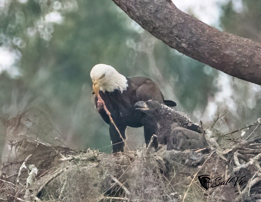 Yesterday: While we watched an immature eagle appeared. The eagle parents immediately took steps to run the intruder off.