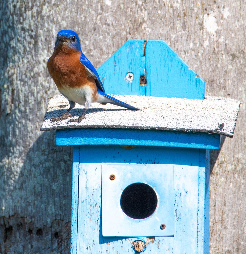 It amazes us what we see just riding around our campground /resort. The men in the woodworking shop have made birdhouses over the years and attached them to trees so randomly we’ll see little birds using them for houses, mostly blue birds. Yesterday we came across one such birdhouse that looked empty but I could hear a woodpecker pecking away at the tree it was nailed to. The woodpecker stuck his head out just long enough for me to get the shot before he flew away. Then the blue bird came back with a look as if to say about time you got out of My House !