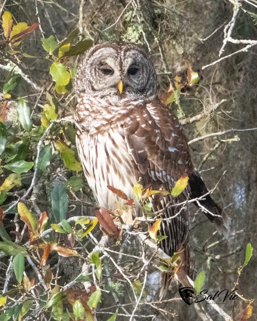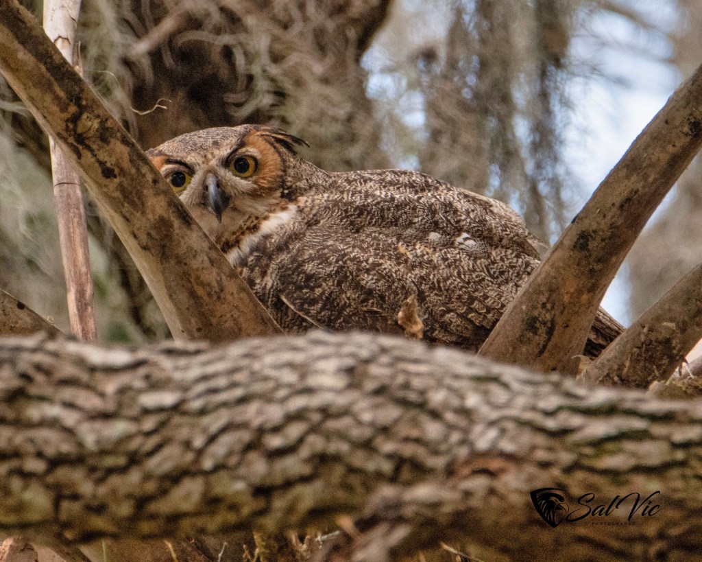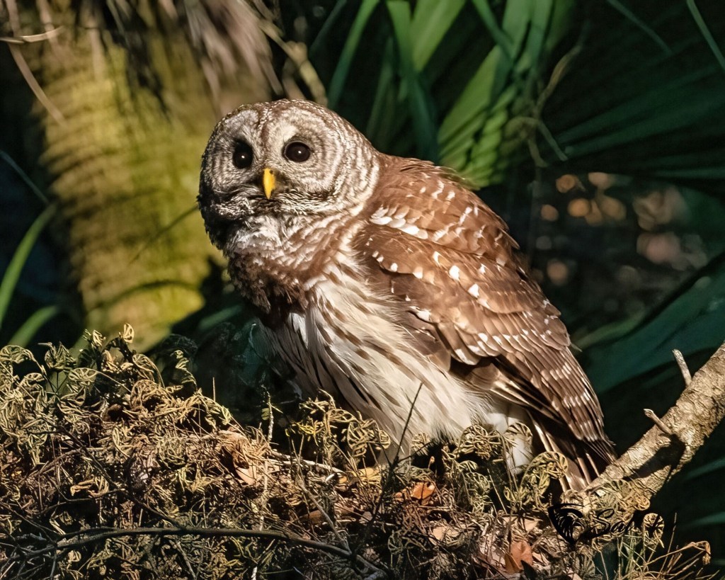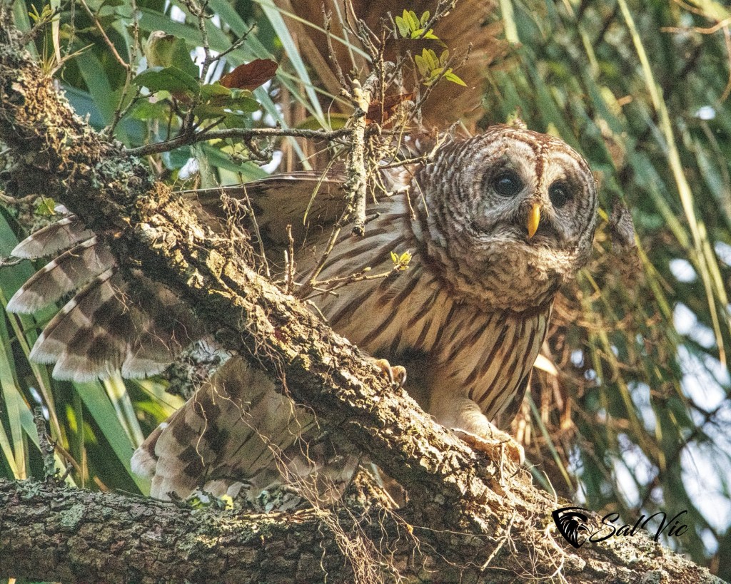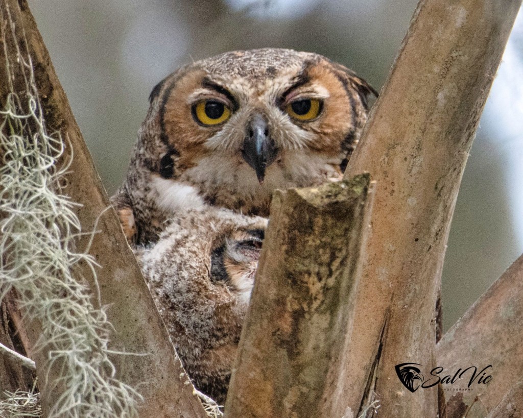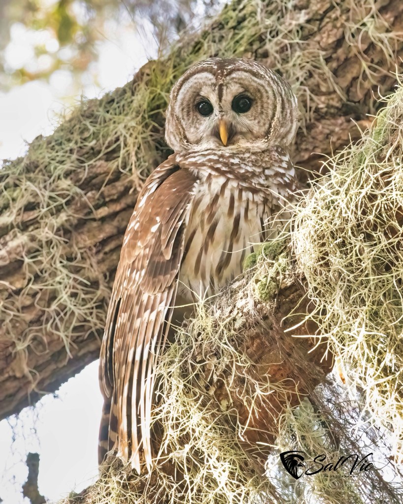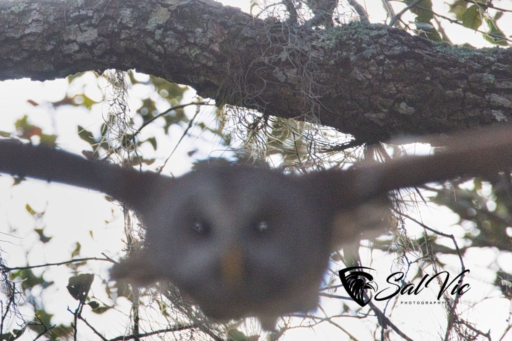 We found an owl nest on a topless palm tree tucked away behind a large tree dripping with Spanish moss. The first day we were there it was somewhat cloudy. Vic had to brighten the picture.