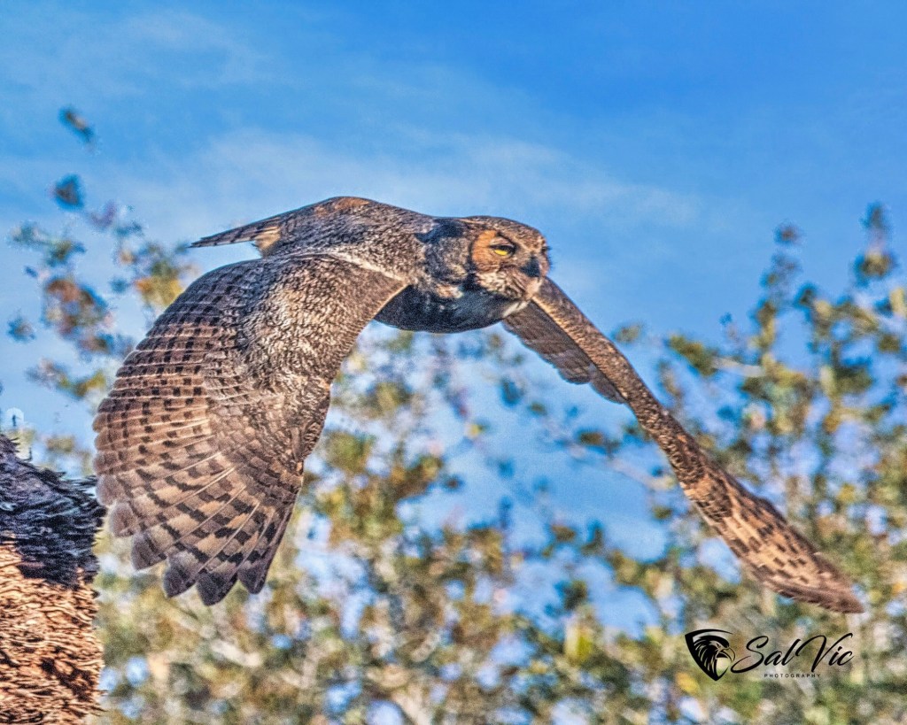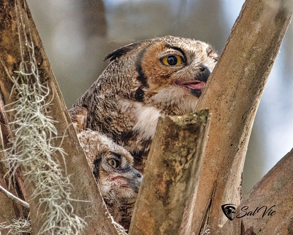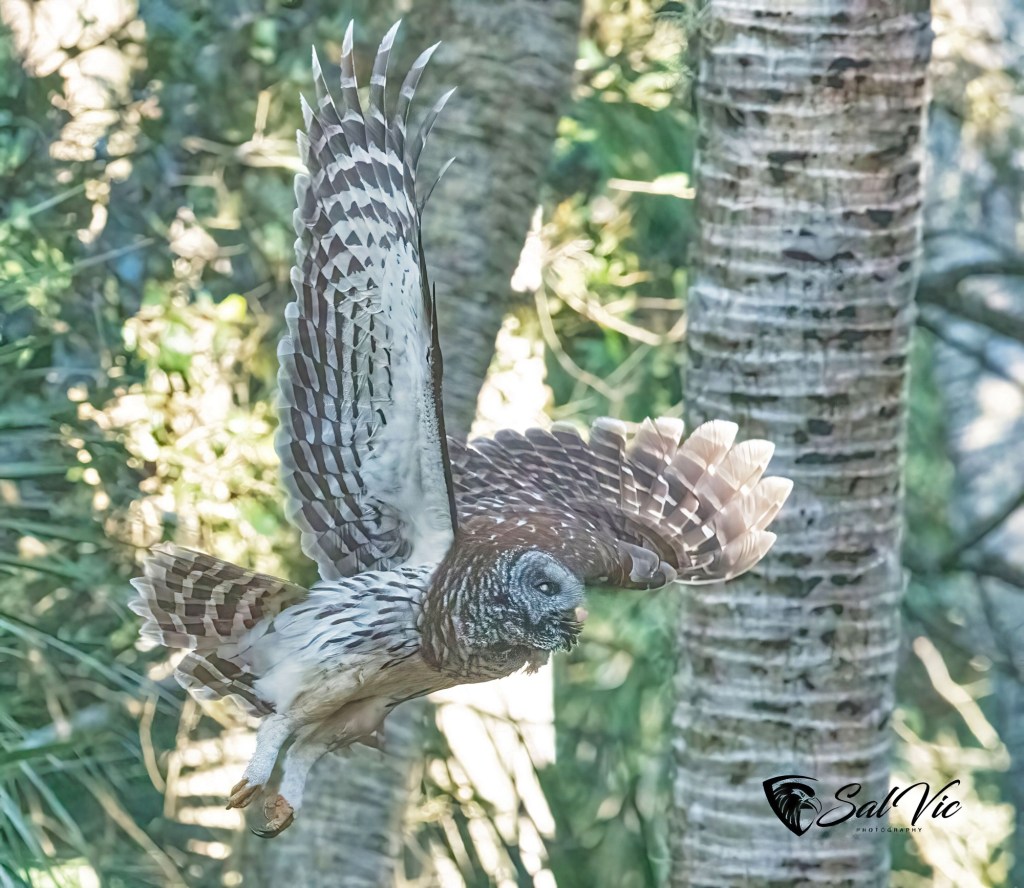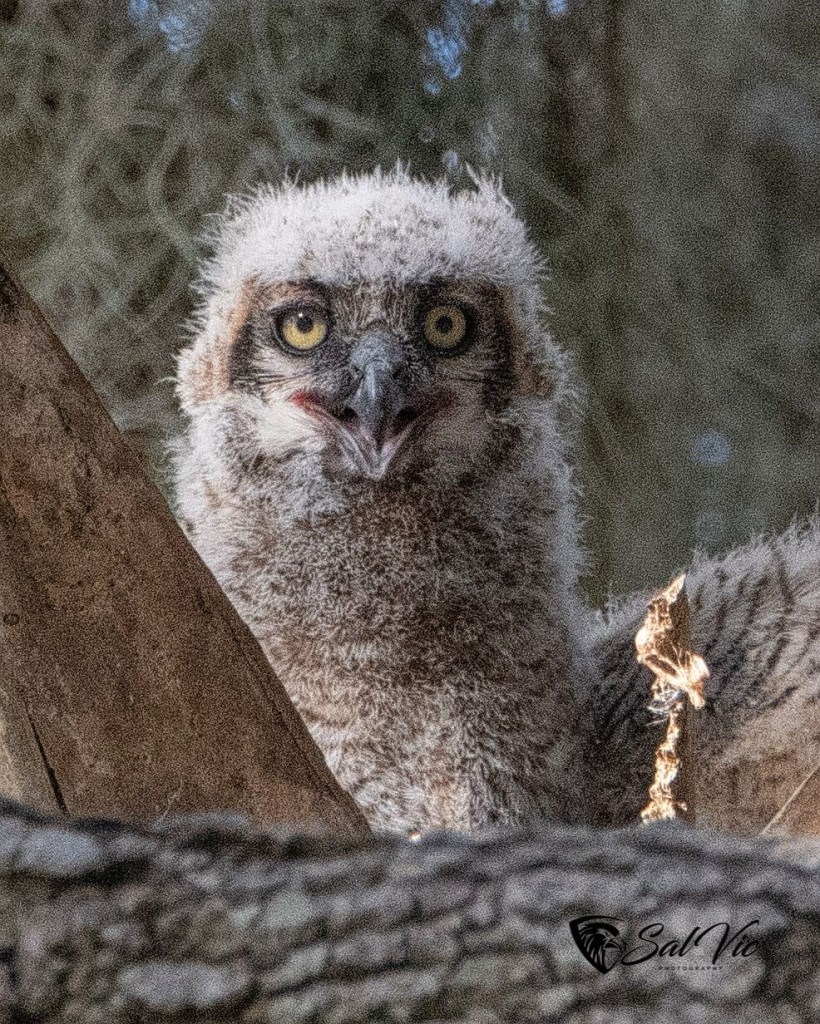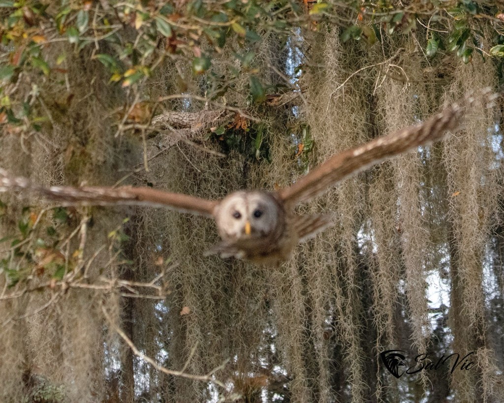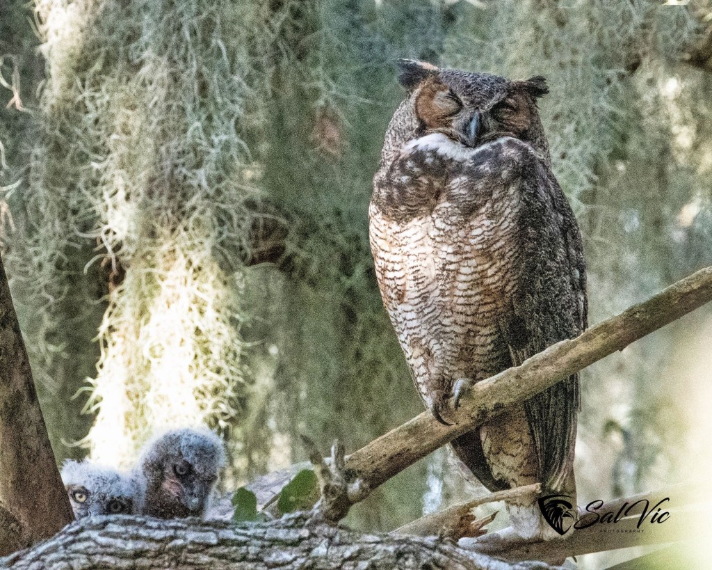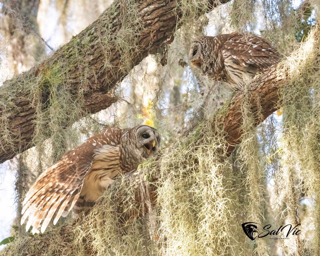 We found an owl nest on a topless palm tree tucked away behind a large tree dripping with Spanish moss. The first day we were there it was somewhat cloudy. Vic had to brighten the picture.