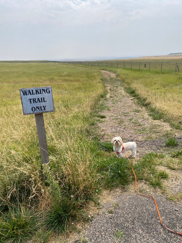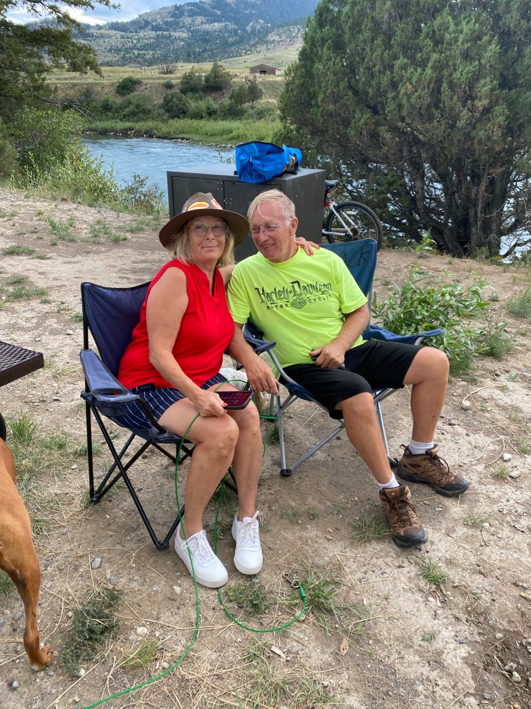 We are still here at Carbella (in Montana) and will probably stay another week. We had 3 hot days – highs in the high 90’s – but mostly we’ve enjoyed high 70’s low 80’s with cool nights. We’ve met many interesting people – sometimes it’s just a little morning chat while we are walking Zoe. Sometimes we get to know them better. Teresa and John “Hawk” were here for several days. Hawk is a retired Marine. Teresa is an artist. We had coffee/breakfast with them a couple of times and a campfire one night. They cooked burgers, I cooked a steak and Vic ate his plant based something. It was fun, their boxer (Chloe) got along with Zoe. When they went home we doused the fire and went inside. I went back out 10 minutes later to bring in something we forgot and found the fire had come back to life in a very big way. All I could figure is it’s very dry here and can be pretty windy. The water must have evaporated. Good grief. I had to pour a gallon plus of water to make it totally go out.