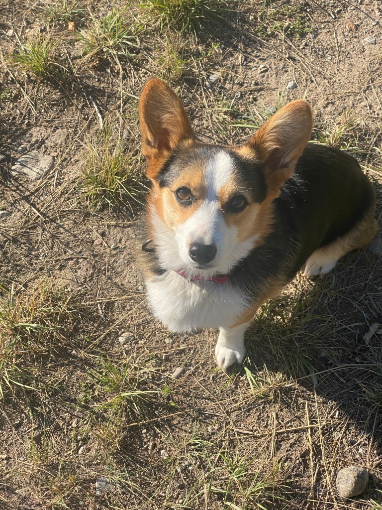 Our campsite (seen from across the Yellowstone River, elevated)This little Corgi named Mitch (but it’s a girl) is here for the weekend. Zoe and Mitch hit it off.