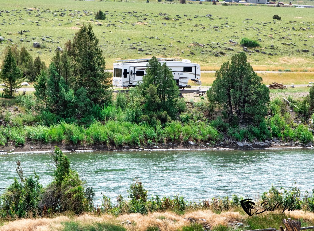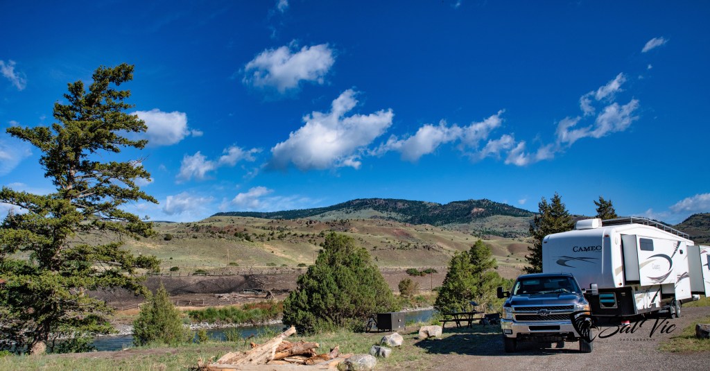 We are camping a few miles from the north entrance of Yellowstone National Park in a gorgeous location, on the Y River, watching kayakers and rafters float by all day. This area is very popular with fishermen, lots of trout fishing. Across the river from our site is a waterfall that we are enjoying the heck out of.