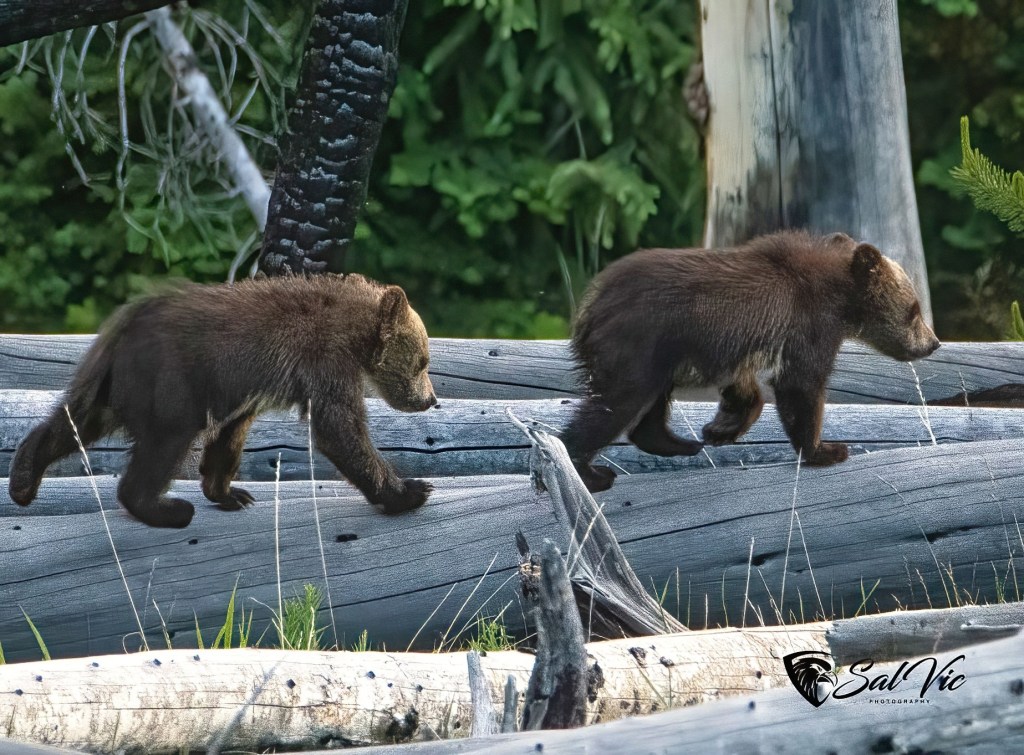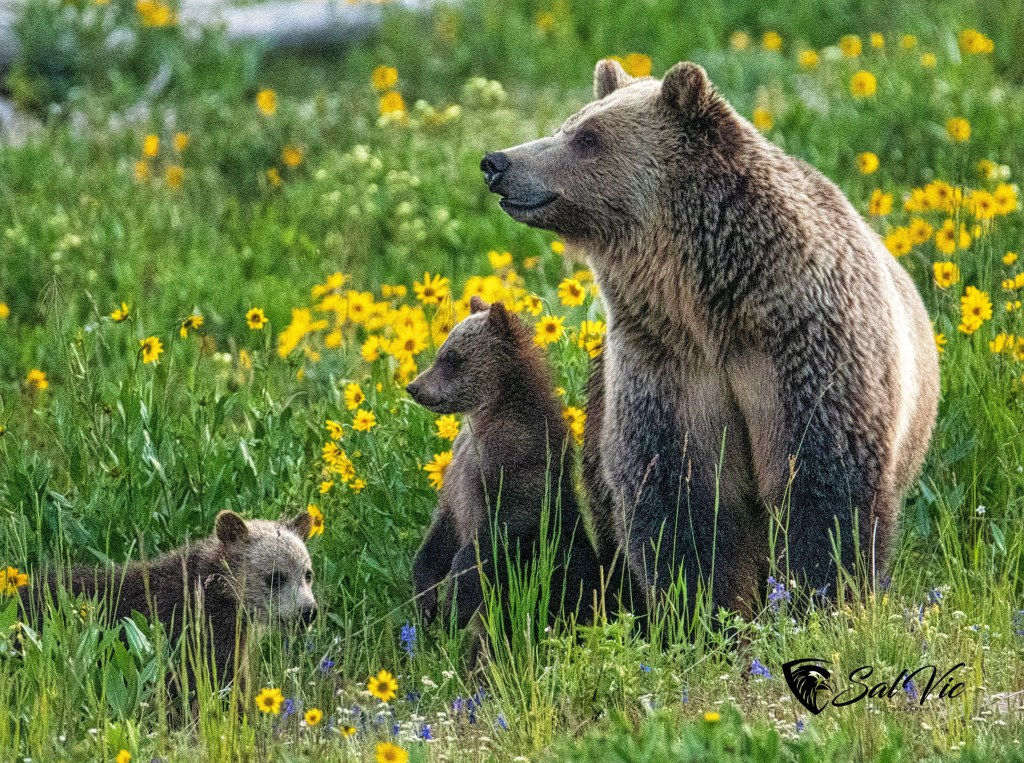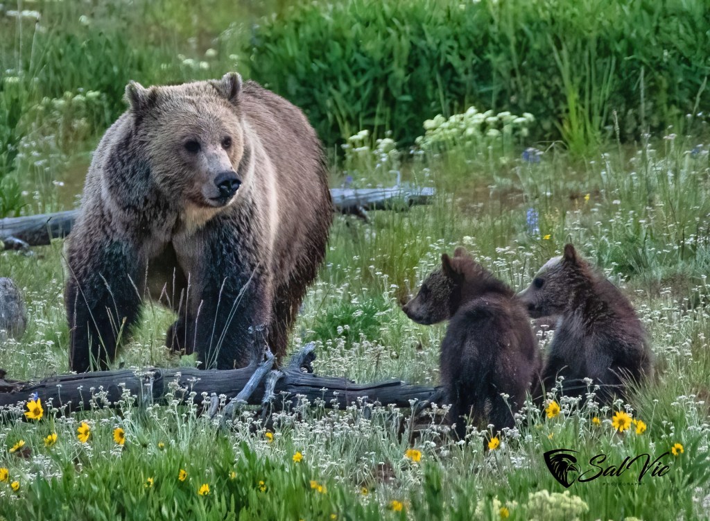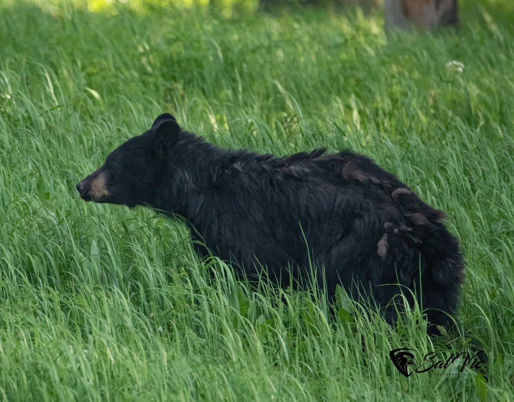 Snow’s cubs are “COY”, cubs of the year. This shot is when Snow “alerted” to another bear and it’s cub in the vicinity. She communicated danger to her cubs and took off running up the hill toward the photographers with the cubs right behind her. The photographers all jumped into their cars!