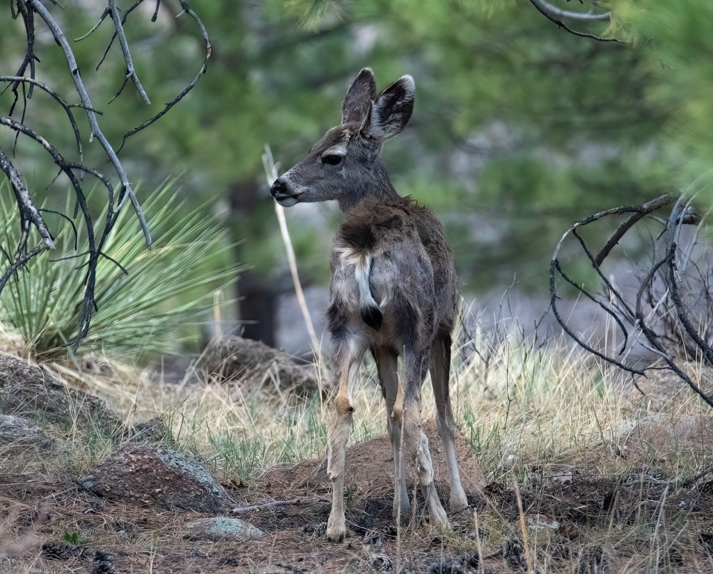 We’ve been saying for quite a while we’d like to be the first ones to see a bear instead of coming upon a big crowd of photographers. It happened! We saw a pair of black bears running in among the trees. I got out and searched but couldn’t find them. Vic meanwhile drove a ways then came back. When I got back in the truck there were the black bears again! They were still running but I managed to get a couple of shots before they ran away.