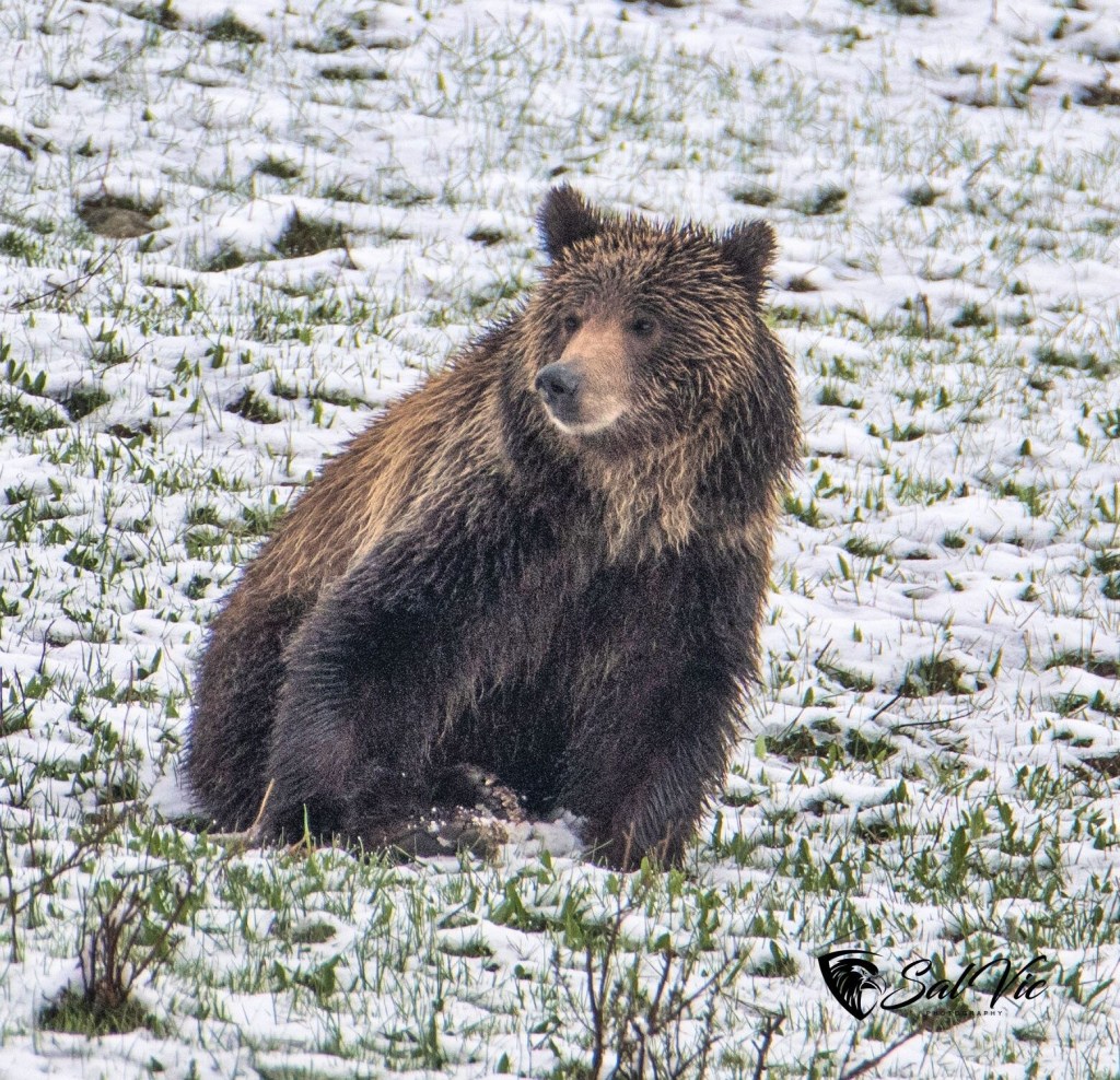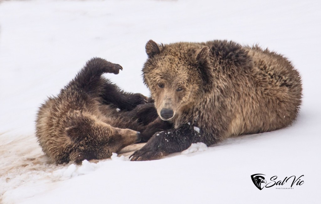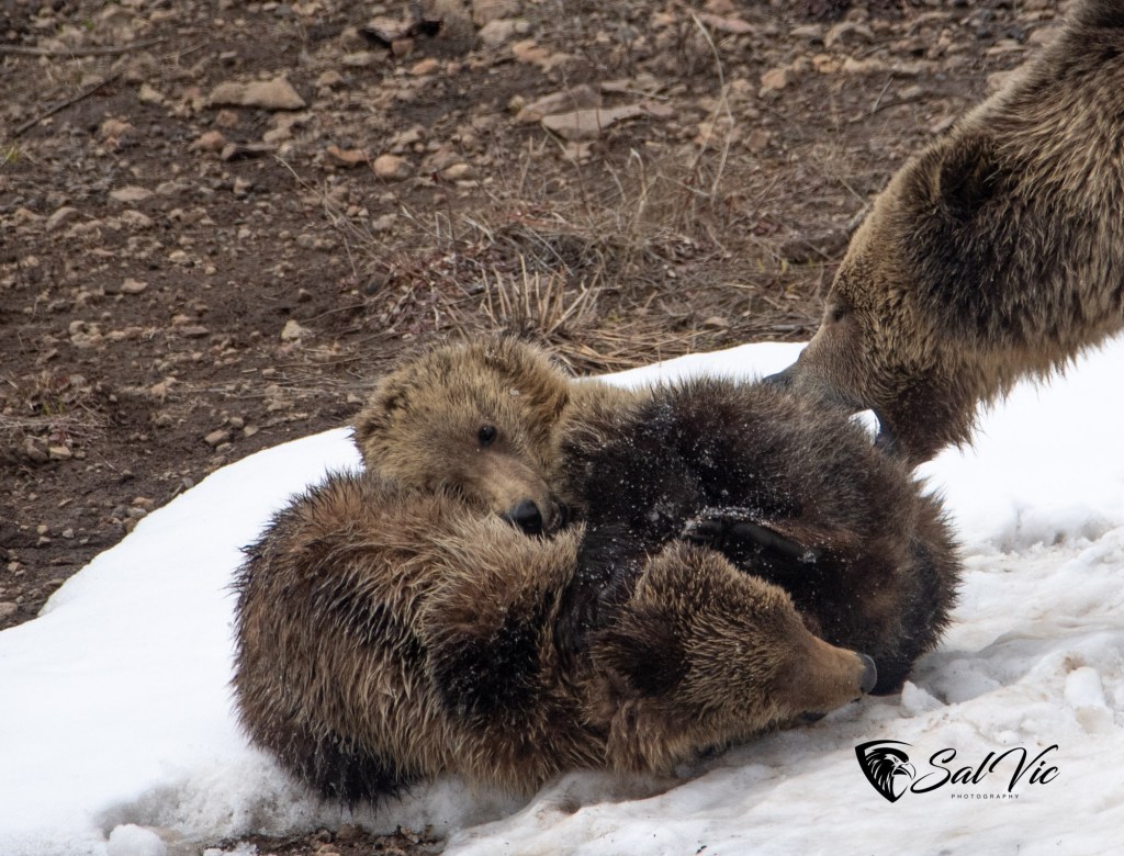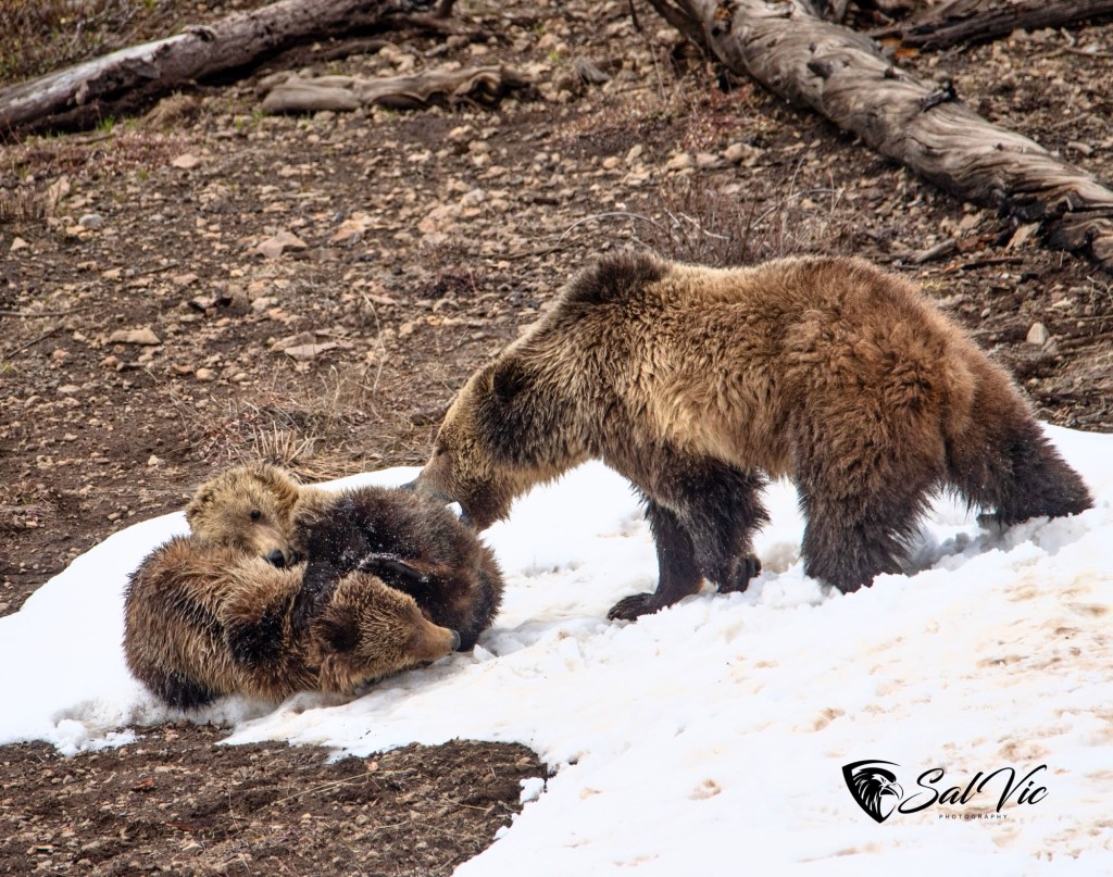What I found was a crowd of photographers taking pictures of a mama grizzly bear playing with her two cubs in the snow. Yes that’s right I said snow. There is a lot of snow still on the ground and it even snowed while we were there!