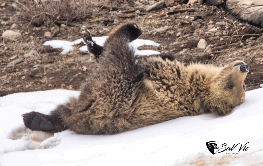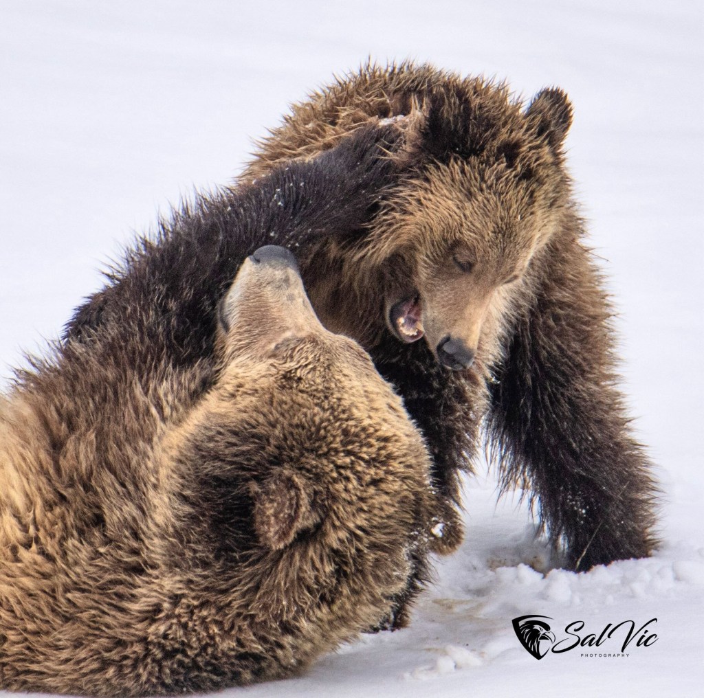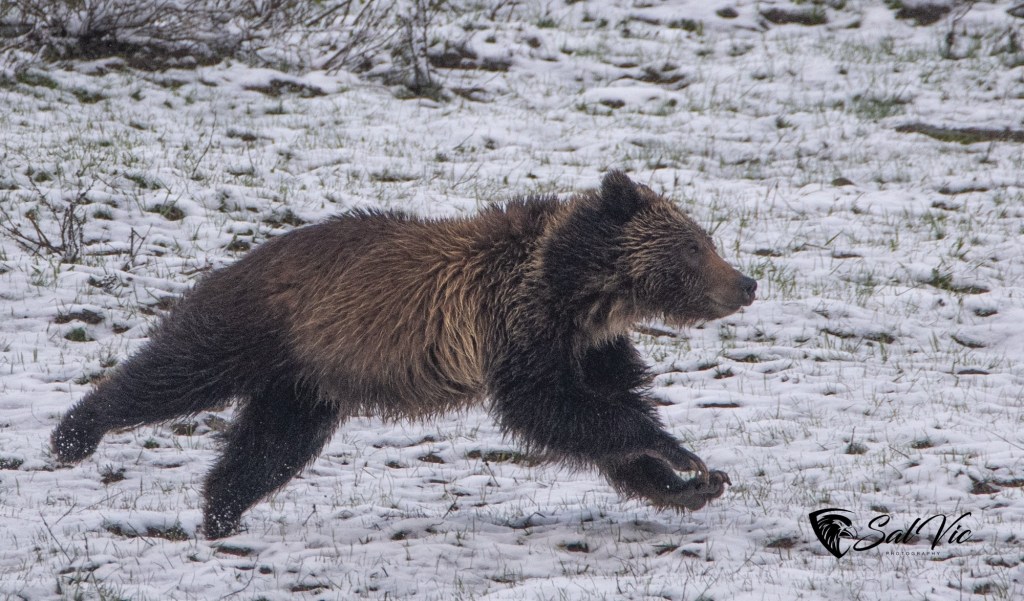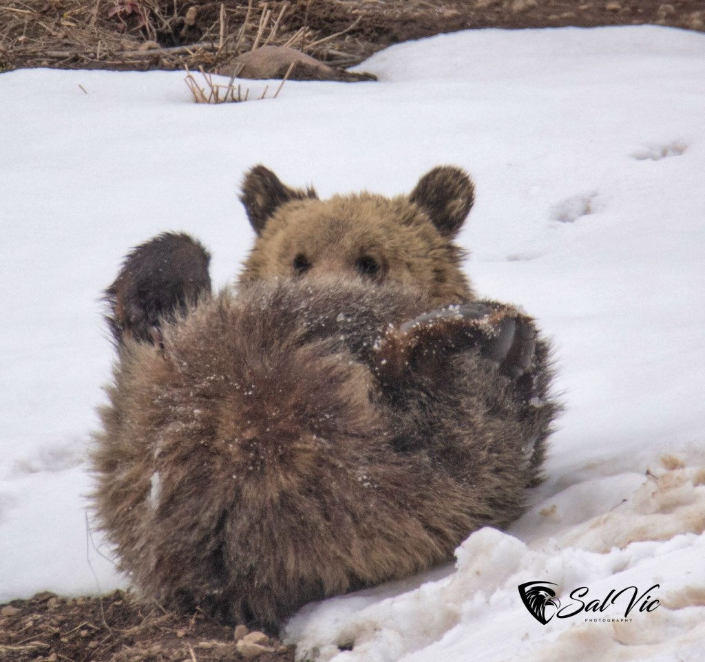 What I found was a crowd of photographers taking pictures of a mama grizzly bear playing with her two cubs in the snow. Yes that’s right I said snow. There is a lot of snow still on the ground and it even snowed while we were there!