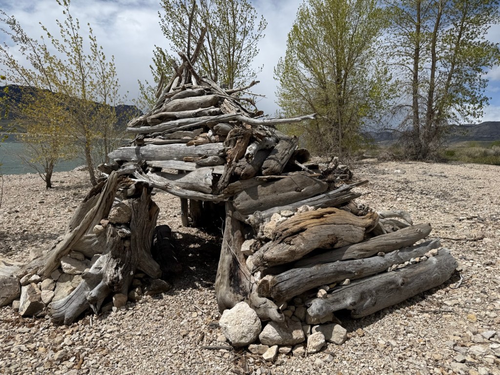 Before I show you the bears I wanted to tell you about the “beach” accessible by walking paths from some of the sites down to the beach and lake. Some unknown people spent a lot of time creating this hut with openings on two sides. Inside there are two logs to sit on with a flat rock in between for a table. It’s big enough that I could easily get inside.