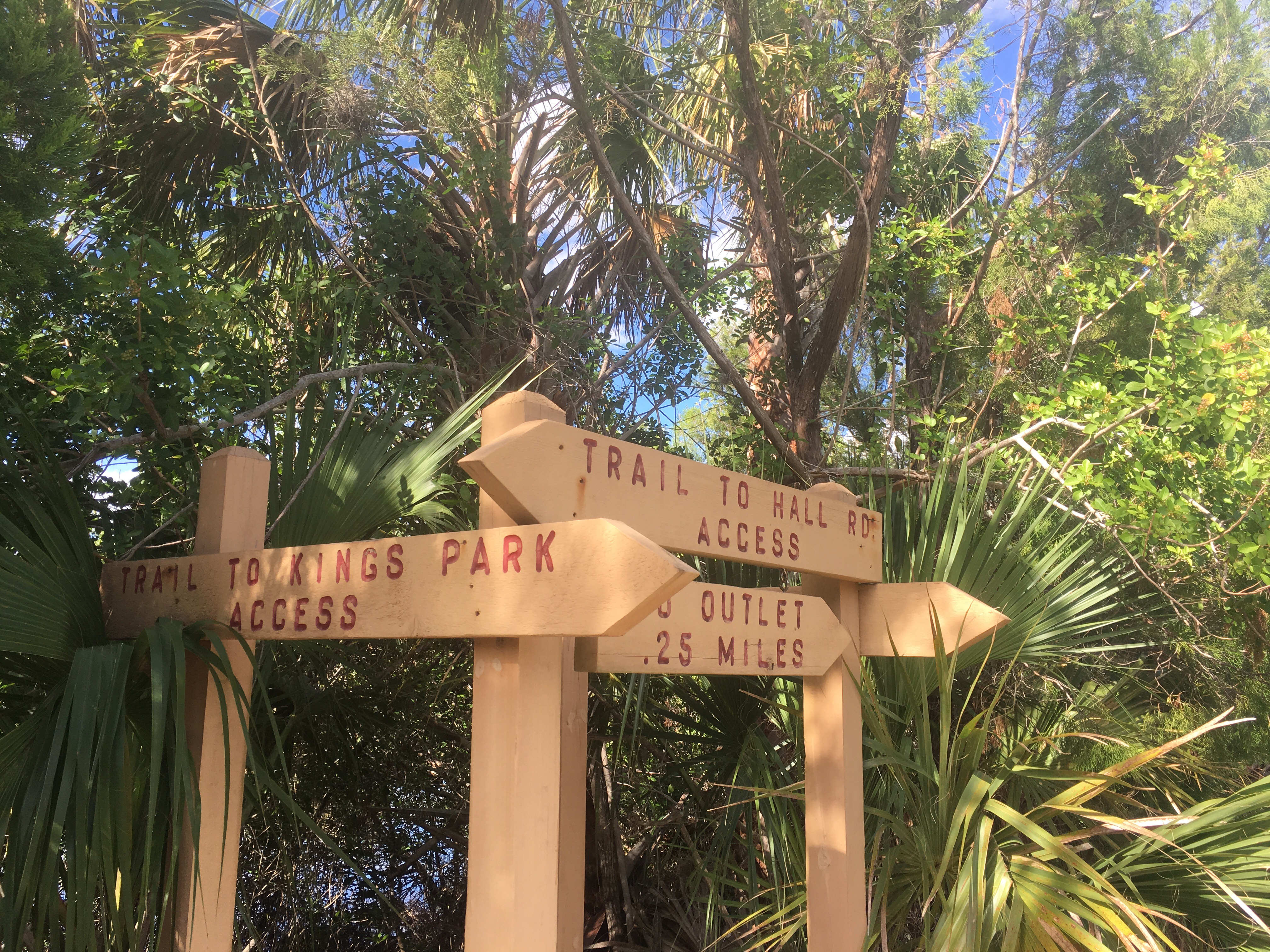 There are signs for a nature trail in KARS Park but the trail is blocked off. Word is the wild pigs and gators are too close for safety. Today we found a trail with a paved path suitable for walking, running and biking. It goes about a mile, then connects to a wooden bridge leading to Kings Park with more pavement. It was very quiet on the trail, I saw one person on a bike. Victor walked in a ways with me and then went back to the truck. He is still having back issues and is working on his distance.
